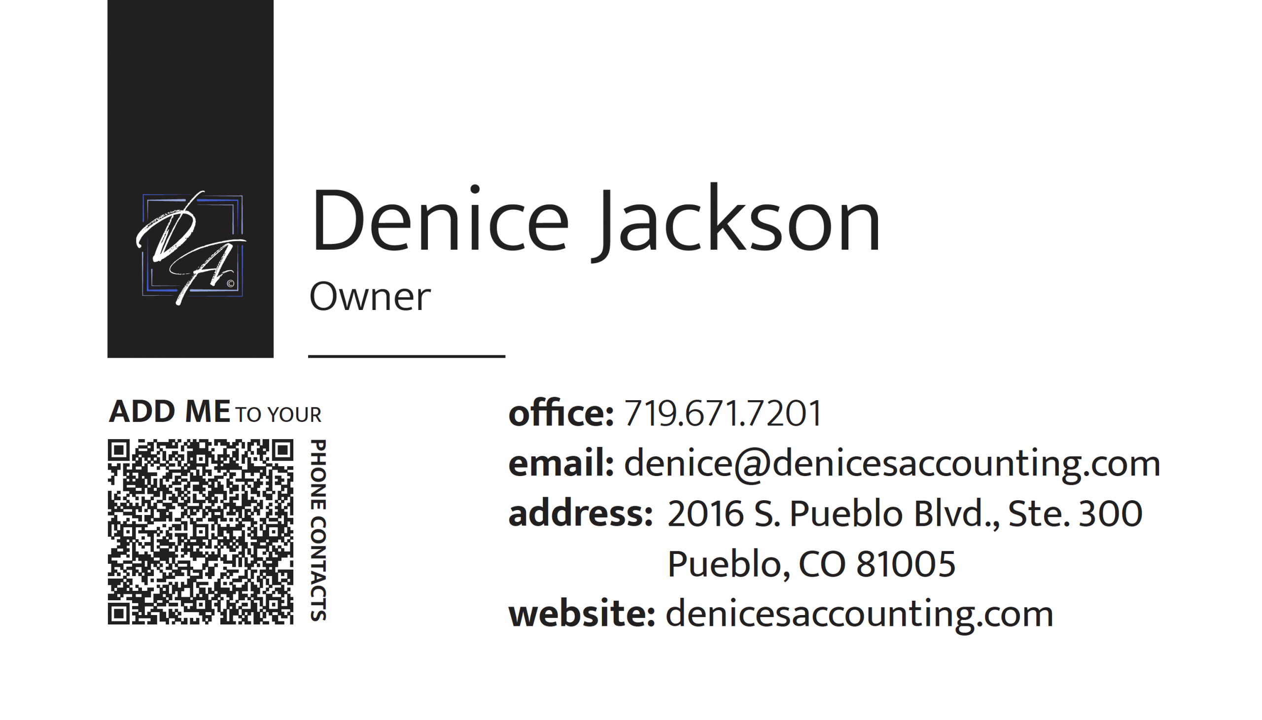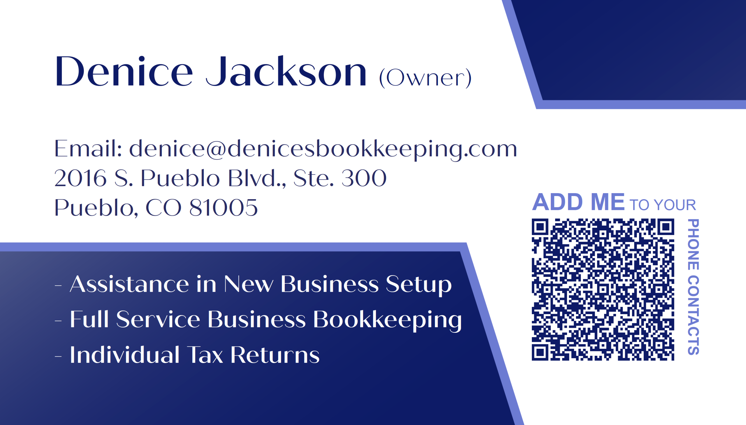 Denice’s Accounting is a professional accounting and tax services firm based in Pueblo, Colorado, dedicated to helping business owners, high-income individuals, and professionals simplify their finances and legally minimize their tax burden. With over 7+ years of experience, Denice focuses on delivering personalized financial solutions that keep clients organized, compliant, and positioned for growth. The firm offers a comprehensive range of services, including bookkeeping, payroll processing and reporting, sales/use tax management, individual tax returns, and strategic tax planning, all designed to reduce tax liability and improve financial clarity. Clients can choose from structured service packages (Bronze, Silver, Gold) or fully customizable à la carte options tailored to fit unique business needs.